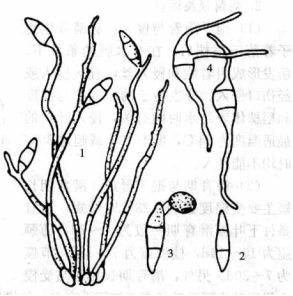 病菌菌絲具有分隔和分枝,初期無(wú)色,后變褐色。分生孢子梗從病組織的氣孔或表皮成簇生出,很少單生,不分枝,一般有2?4個(gè)隔膜,基部較粗,頂部較細(xì),分生弛子脫落后,梗頂部成曲折狀。分生孢子無(wú)色或淡褐色,洋梨形或倒棍棒形,頂端鈍尖,基部鈍圓,有腳胞,成熟后常具2個(gè)隔膜。多數(shù)砲子萌發(fā)時(shí)從頂部或基部細(xì)胞萌發(fā)伸出芽管,芽管頂端形成球形或卵圓形、褐色、厚壁且光滑的附著胞,然后長(zhǎng)出侵染絲,侵入寄主組織。