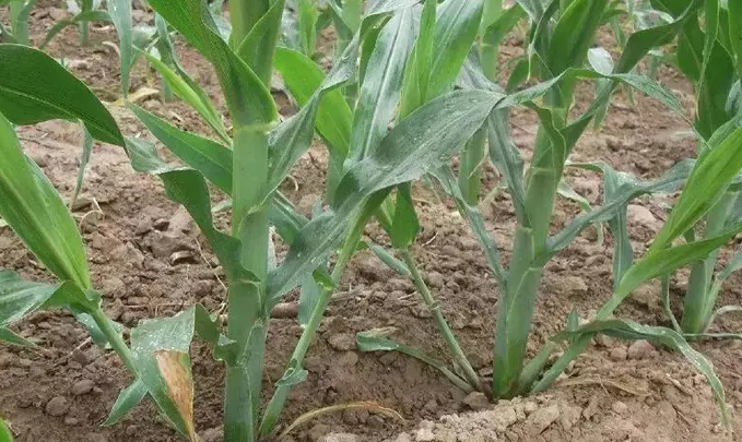 玉米整個生育期都可染病,以苗期感染的植株受害最重。初期在心葉中脈兩側(cè)葉脈間出現(xiàn)虛線狀失綠透明小點,后透明線點逐漸增多,葉背主脈上出現(xiàn)長短不一的蠟白色條狀突起。心葉多卷縮,其他葉片濃綠、僵直、寬短。重病株生長遲緩,節(jié)間縮短,明顯矮化,株高一般不及正常植株的一半。葉片多不能展開,頂部葉片叢生。莖稈呈錐狀。雄性花序不能抽出或退化,雌穗退化或變形,不結(jié)實。感病晚的輕病株雖可以抽穗,但雄性花序發(fā)育不良,散粉少或不散粉,雌穗短,花絲少,子粒減少。