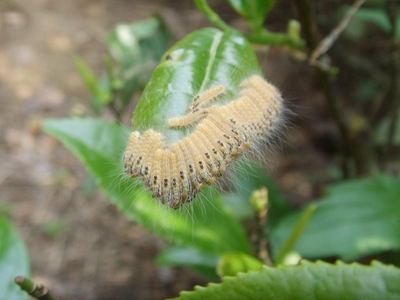 茶毛蟲以幼蟲咬食葉片為害,嚴(yán)重時(shí)可將葉片食光,影響茶葉產(chǎn)量和樹勢;幼蟲體上毒毛觸及人體皮膚會(huì)引起紅腫痛癢,嚴(yán)重影響茶園管理。雌蛾產(chǎn)卵于老葉背面,幼蟲孵化后群集在老葉背面咬食下表皮和葉肉,留上表皮呈黃綠色半透明薄膜狀。三齡起開始分群向上遷移,數(shù)十頭至百余頭整齊排列在葉片上,同時(shí)咬食葉片成缺刻。除茶樹外,該蟲還為害油茶、柑橘、山茶、烏柏、玉米等多種作物。