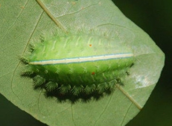 幼蟲:體長為21?26mm,扁平橢圓形,背部稍隆起,淡綠色,背線灰白。每體節(jié)有4對綠色枝狀毒刺,其中蟲體兩側邊緣的1對較大,亞背線上的1對較小,中背線灰白色,體背中央兩側各有1個紅點。
