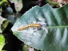幼蟲共5齡。一、二齡為潛葉期,潛食葉肉,葉背呈現(xiàn)彎曲帶狀潛道。三齡和四齡前期為卷邊期,吐絲將部分葉緣向背面卷折,匿居咀食葉肉,后期僅留上表皮。四齡后期和五齡為卷苞期,將葉尖向葉背卷結(jié)成三角形蟲苞,匿居其中咀食葉肉,至后期僅留一層上表皮。一般是1個苞內(nèi)只有1頭幼蟲,也時有2頭以上的。幼蟲排出的糞便堆積在苞內(nèi),對芽葉造成嚴重污染,且常轉(zhuǎn)移他葉結(jié)苞為害。