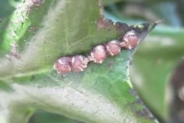 若蟲(chóng):一齡卵圓形,扁平,長(zhǎng)約0?4mm,紅褐色,觸角6節(jié),足3對(duì)發(fā)達(dá),腹末有1對(duì)細(xì)長(zhǎng)尾絲。二齡卵圓形,略拱起,紫紅色,足退化,體表泌蠟開(kāi)始形成淡紫紅色介殼,且背中略作長(zhǎng)橢圓形隆起,頂部白色,周緣呈現(xiàn)8個(gè)角突。三齡雌若蟲(chóng)介殼增大加厚。