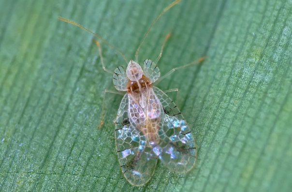 成蟲:體長2.1?2.4mm,剛羽化時呈銀白色,后逐漸轉(zhuǎn)變?yōu)榛野咨?。頭小,棕褐色,復(fù)眼大而突出,黑褐色。觸角4節(jié),第三節(jié)細長,約為全長的1/2,末節(jié)稍膨大,棕褐色。具刺吸式口器,喙4節(jié),末端黑色,伸達后足基節(jié)間。在前胸背板兩側(cè)及頭頂部分有一塊白色突出膜,上具網(wǎng)狀紋,形狀特異,似“花冠”,側(cè)背板呈翼狀擴展,并向上翹起,前部形成囊狀頭兜,前尖后圓,覆蓋頭部,后部與三角突的壁狀中脊相連接,兩側(cè)為小翼狀的側(cè)脊。胸部腹板的中央兩側(cè)隆起,中央呈槽狀,前窄后寬,喙置于槽中。足細長,跗節(jié)1節(jié),末端具2爪。前翅膜質(zhì),近透明,長橢圓形,基部窄,端部寬圓,凹凸不平,膜質(zhì)透明,具網(wǎng)狀紋,翅基及近端 部有黑色橫斑,翅緣具毛,前翅遠超過腹末;后翅狹長,無網(wǎng)紋,僅達腹末,寬約為前翅的1/3,無網(wǎng)紋,有毛。雌蟲腹部可見8節(jié),末端錐形,產(chǎn)卵器明顯;雄蟲腹部瘦長,可見7節(jié),腹末平截,具1對鐮刀狀抱器。